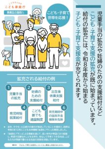 Home お知らせ 令和8年4月1日より、子ども・子育て支援金制度が始まりました お知らせ 2026年04月01日 令和8年4月1日より、子ども・子育て支援金制度が始まりました 令和8年4月1日より、子ども・子育て支援金制度が始まりました。 詳細は掲載しています子ども・子育て支援金制度についてのリーフレットをご確認ください。 なお、制度に関するお問い合わせにつきましては、リーフレットに記載されているコールセンターへお問い合わせください。 【事業主向け】 【個人向け】 戻る